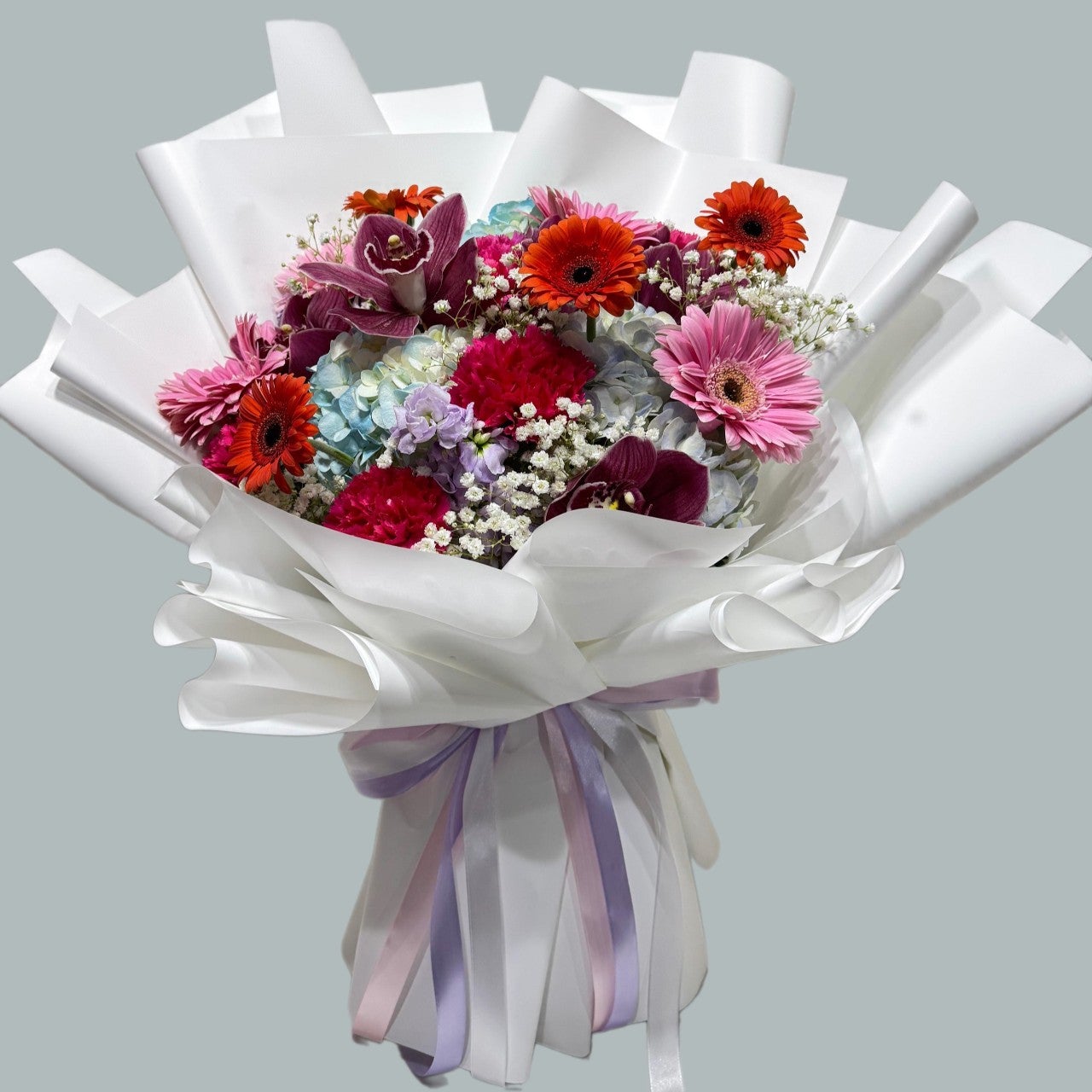 A joyful explosion of coluor and floral beauty, this bouquet is the perfect way to celebrate any special occasion.