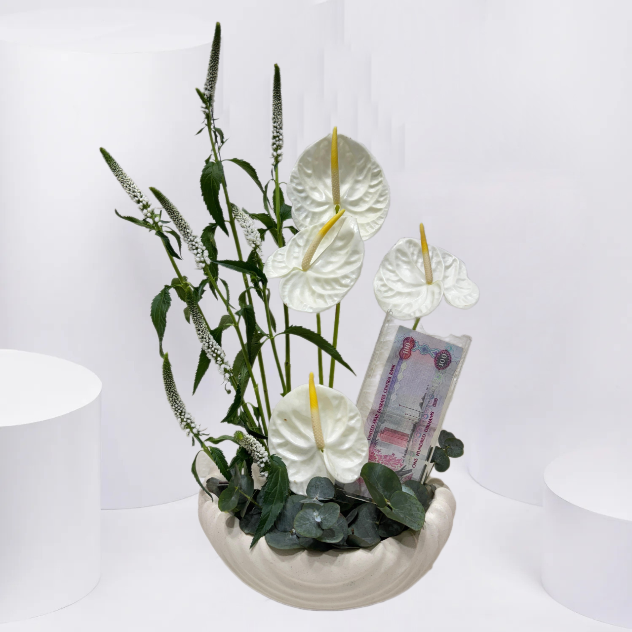 Symbolizing purity and grace, this stunning display of white Anthuriums is enhanced with a cash gift, making it a truly meaningful present for any joyous event.